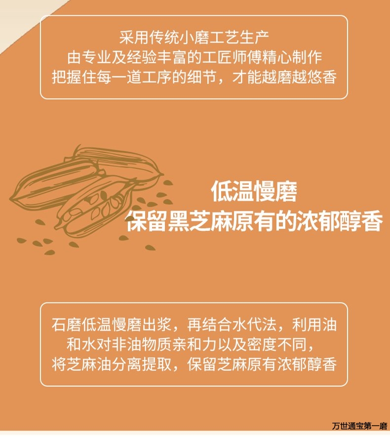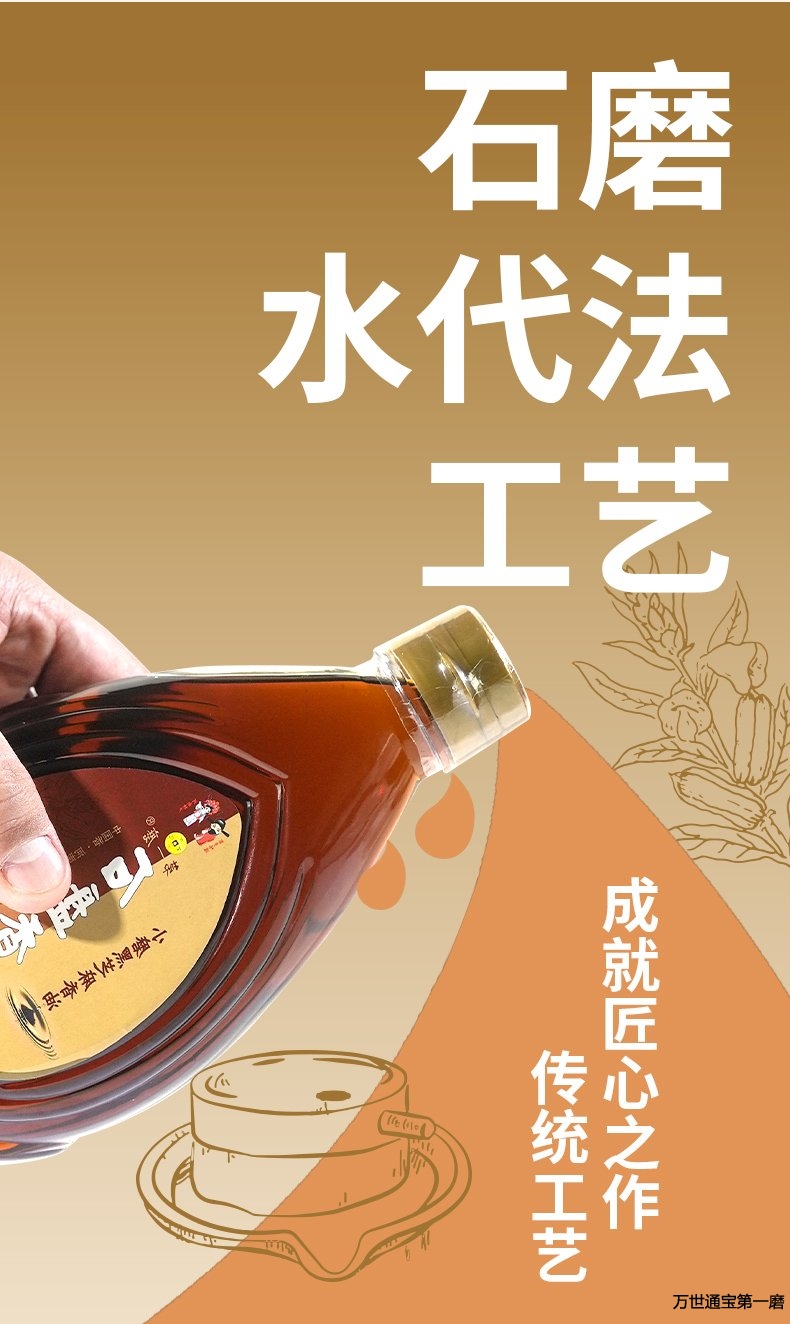4.石磨低温慢磨出浆,水代法取油,传统工艺缔造匠心品质。